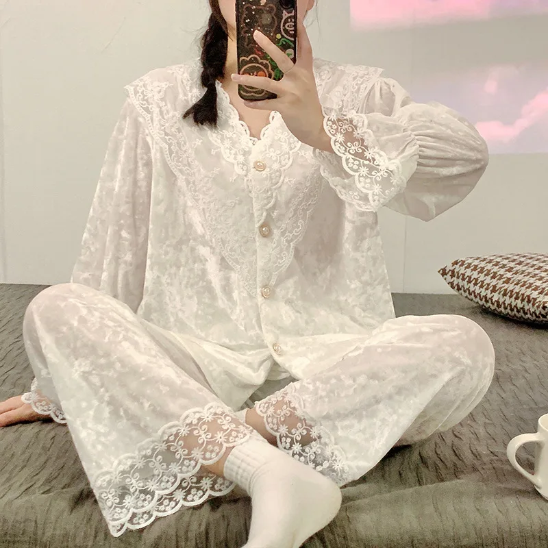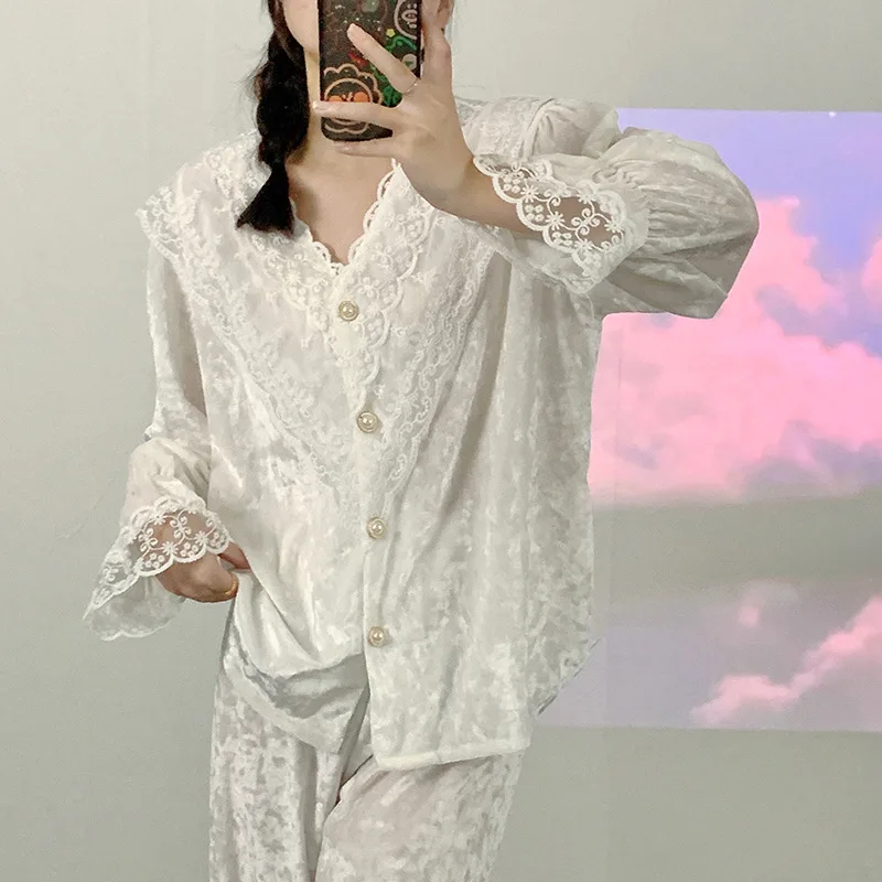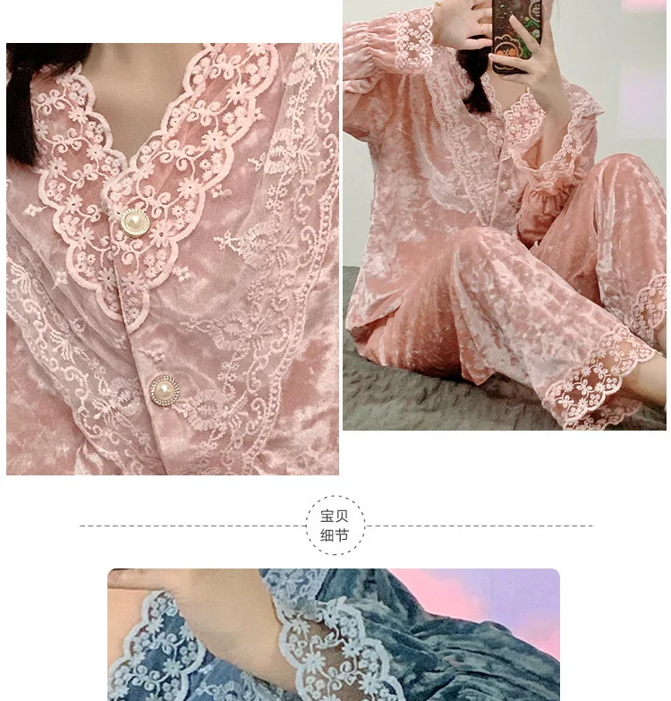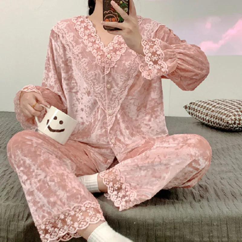 الكورية أنيقة الذهب المخملية منامة للنساء الحلو الدانتيل طويلة الأكمام ملابس خاصة مجموعة الخامس الرقبة الربيع الخريف المنزل الملابس