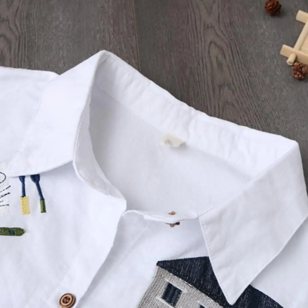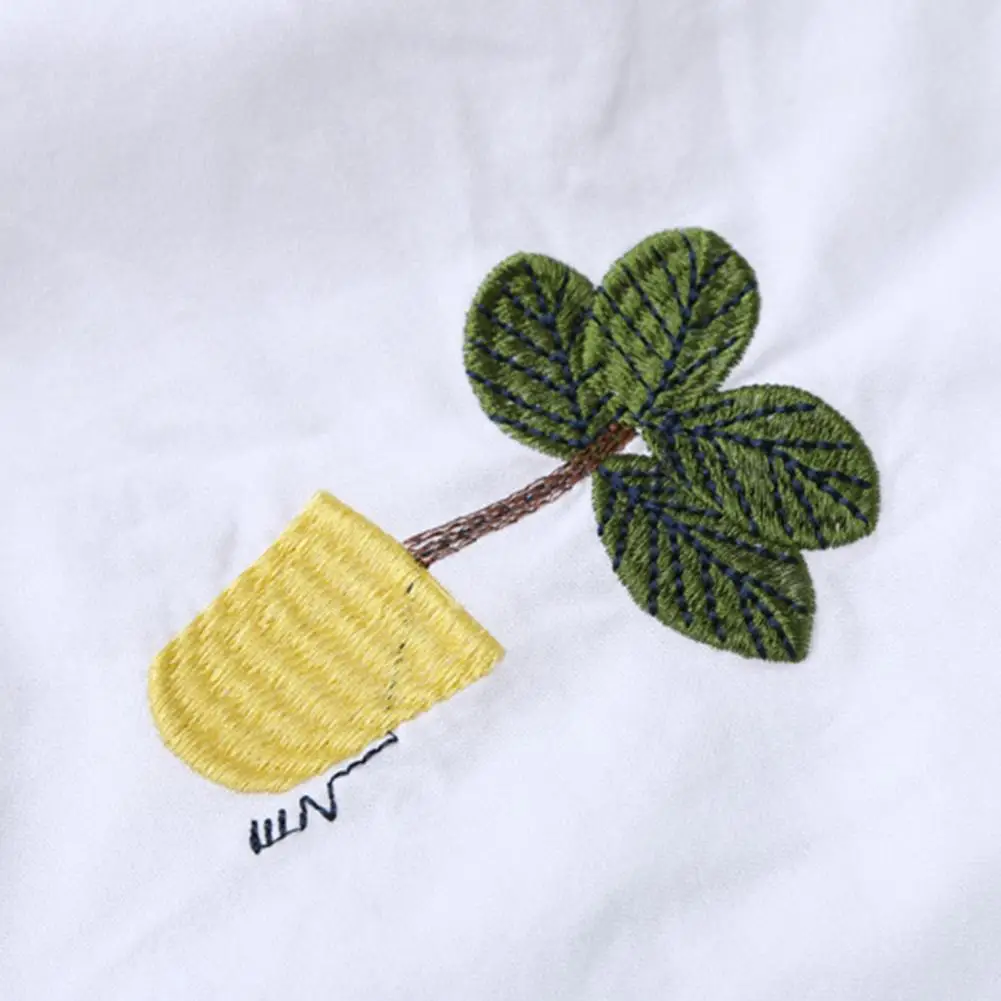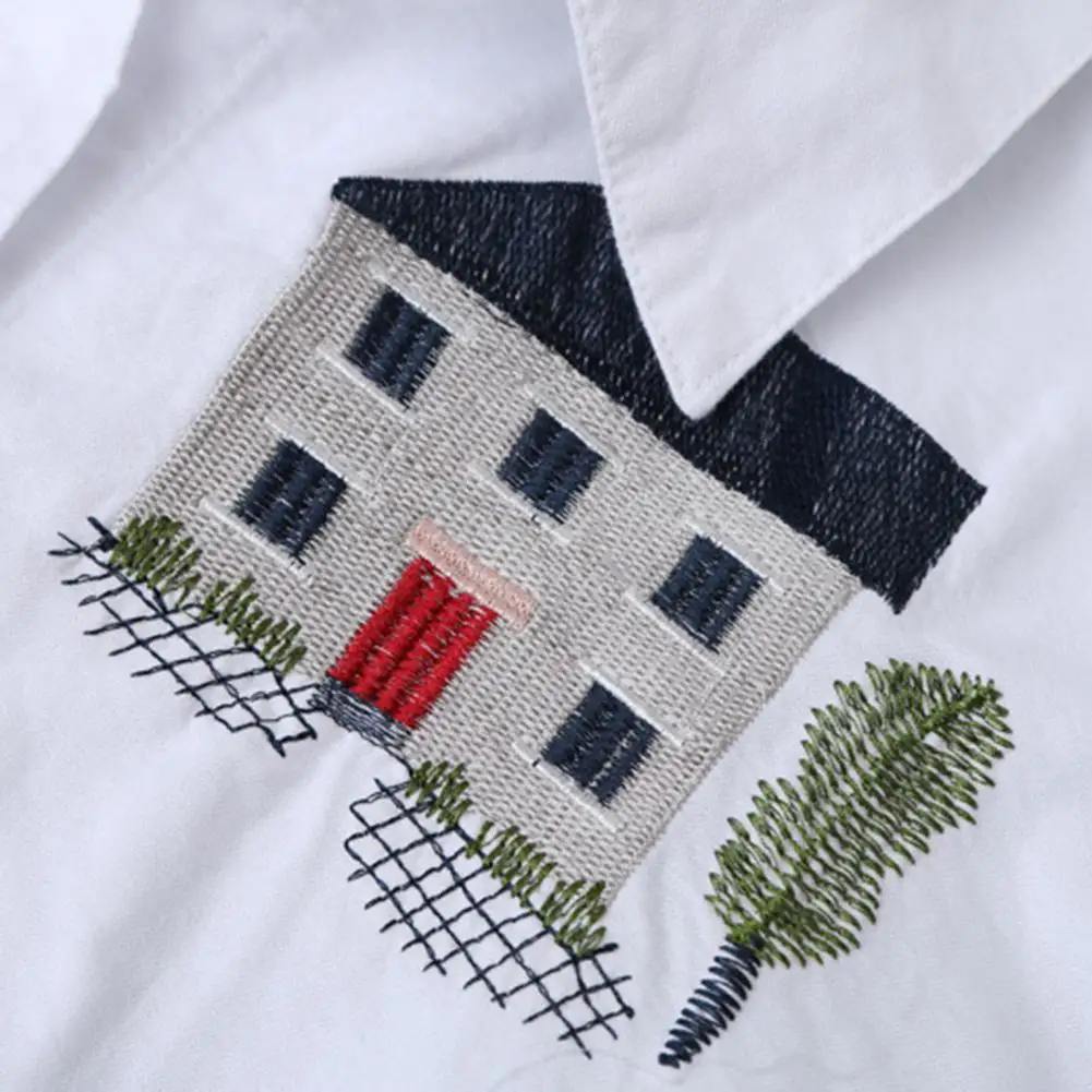 Spring Women Shirt Cartoon Embroidery Loose Irregular Hem Top Solid Color Turn-down Collar Single-breasted Shirt For Daily Wear