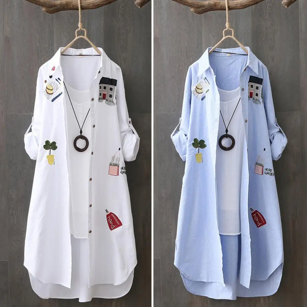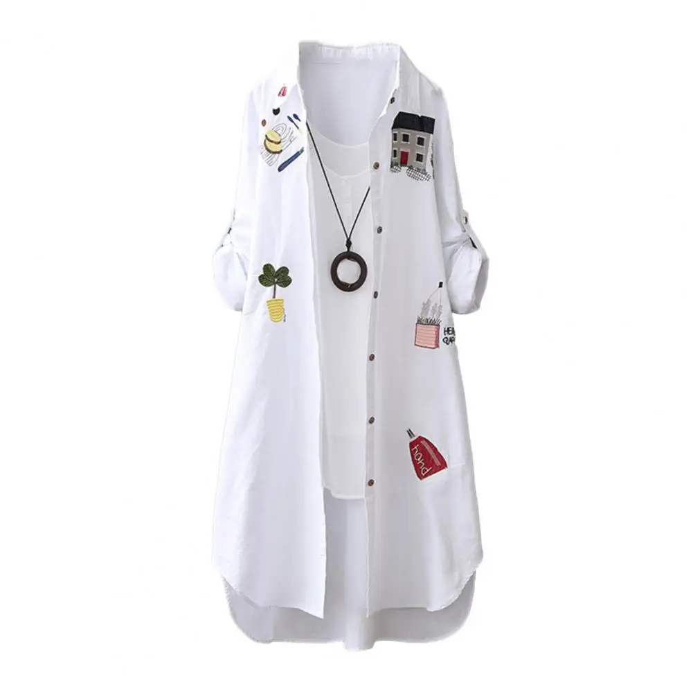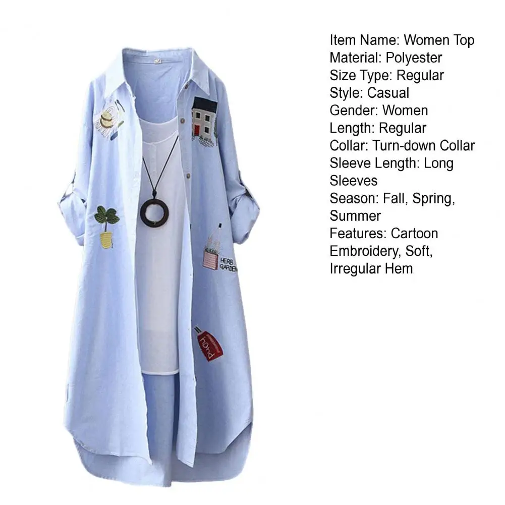 Women Spring Top Cartoon Embroidery Loose Irregular Hem Solid Color Turn-down Collar Single-breasted Sun Protection Soft Breathable Long Sleeves Mid Length Shirt